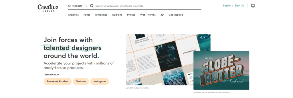 Фотосток, где можно создать свой магазин и продавать шрифты, иконки, шаблоны, плагины, векторные иллюстрации, материалы для 3D-печати и многие другие дизайнерские продукты.