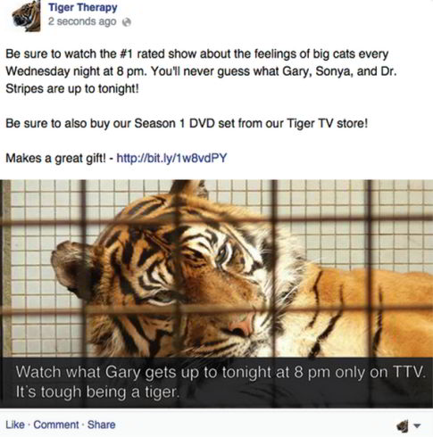 В этой публикации страница Tiger Therapy не привносит ничего полезного или интересного для пользователя, а только пытается разжечь его любопытство и заставить посмотреть передачу про тигра Гари. Более того, во второй части поста, появляется совсем неприкрытый призыв к действию купить dvd с программой + излюбленная маркетологами короткая ссылка для сбора информации о кликах. Ребята, Фейсбук официально об этом не говорит, но он такие ссылки очень не любит, так как очень многие ими пользуются для того, чтобы увести народ, куда им нужно. Мой большой вам совет — перестаньте использовать такие ссылки, так как Фб теперь (на 99% уверена в этом!) будет заведомо снижать охват публикаций с короткими ссылками. Если вам нужно отправить пользователей на какой-то сайт, то используйте родные публикации-ссылки.