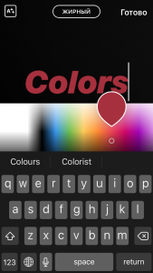 Вам хватает оттенков цветов для текста в Сториз? Если все же есть потребность самостоятельного подбора цвета, то вам поможет палитра градиентных цветов. С ее помощью вы можете выбрать любой оттенок. Для ее открытия вам нужно просто выбрать любой цвет из предложенных, и подержать на нем палец несколько секунд до появления палитры. Затем передвигаете курсор по ней и выбираете нужный вам оттенок.