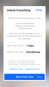 - Напишите нужный вам текст. Для редактирования цвета текста и разных эффектов нажмите на букву T. Когда все будет готово, нажмите на голубую галочку. При желании можно оплатить $20 за год после тестового периода (7 дней). На платном тарифе нет водяного знака и доступны все эффекты для редактирования текста.