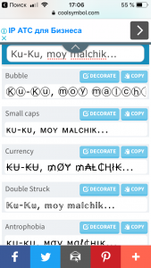 Заранее подготовьте картинку для Сториз. Далее на телефоне откройте мобильный браузер и перейдите по адресу: coolsymbol.com (легко запоминается) . Вам нужна вкладка «Fance Text». Вводите необходимый текст и он автоматически преобразуется в новые шрифты из которых можно выбирать подходящий вариант. Выбрали шрифт, нажали справа на кнопкку «Copy» и можно начинать загружать картинку в Сториз.