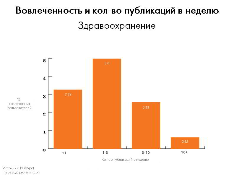 У компаний, относящихся к тематике здоровья, статистика показала интересный момент — чтобы добиться самой высокой вовлеченности, публиковать им «выгоднее» всего несколько раз в неделю, а именно 1-3 раза в семь дней. Иногда, например, при проведении маркетинговых кампаний и акций, можно перейти границу и публиковать около одной публикации в день. Исходя из данных исследования, для сектора здравоохранения — больше совсем не значит лучше, поэтому будет логичнее держаться золотой середины — 1-5 постов.