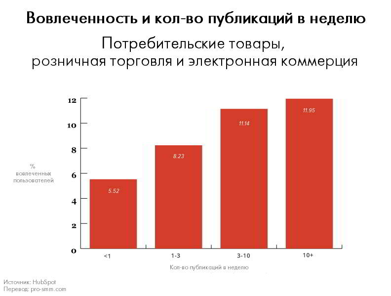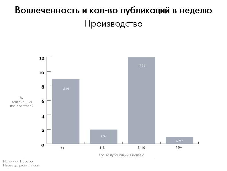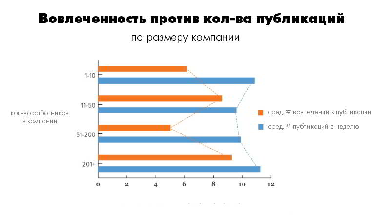 Не смотря на высокую активность маркетинговых агентств, самой высокой активностью аудитории могут похвастаться компании, публикующие всего 3-10 публикаций в неделю. Маркетинг — штука сложная, а соц. сети стремительно развиваются, — отсюда и интерес публики к новой, интересной информации и желание потреблять больше контента. Но опять таки, не стоит забывать о качестве публикаций, так как количество, само по себе, особой ценности не несет.