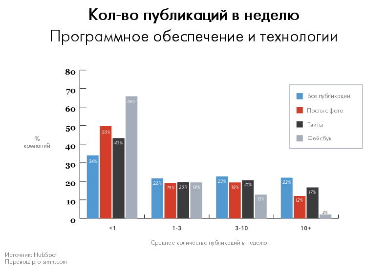Примечание: Заметьте, что говорим мы здесь не только про Фейсбук, но и про другие соц. сети тоже. HubSpot точно не определил в методологии исследования, какие соц. сети они считали, но как минимум публикации распределяются на Фейсбук и Твиттер.