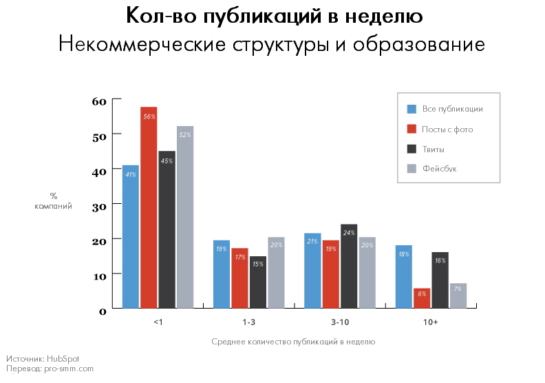 Нон-профиты и образовательные компании у нас, кстати, являются лидерами по публикации 10+ постов в неделю на Фейсбук, а также занимают второе место по публикации 10+ постов вообще.