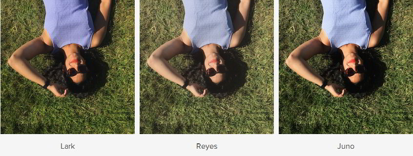 Если интересны детали, то фильтр Lark уменьшает оттенки красного, добавляя больше голубых и зеленых тонов. Этот фильтр больше всего подойдет для придания насыщенности фото с пейзажами, травой, небом, морем и т. д. Фильтр Reyes немного «запыляет» ваши фото, придавая им винтажный look. Ну и последний фильтр Juno больше подойдет для фото с людьми и для портретов. Его отличительная особенность в том, что он добавляет немного зелени холодным оттенкам, при этом насыщая теплые тона и добавляя сияния белому цвету. Мне лично этот фильтр нравится больше всего :))