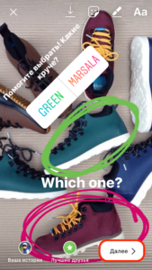 В моём примере на фотографии с ботинками, главным вопросом в голосовании является фраза: «Помогите выбрать! Какие круче?» И 2 варианта ответа: Green/Marsala.