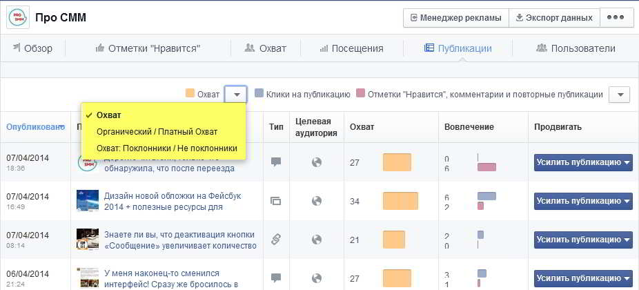 В статистике на Фейсбук органический охват можно найти во вкладке «Публикации». Обращаю ваше внимание, что вы можете здесь узнать как общий охват, так и охват поделенный на поклонников и не поклонников.