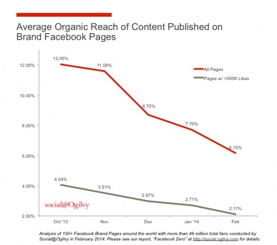 Похожее исследование провели и в агентстве Social@Oligvy. Результаты оказались примерно такие же, как и на графике выше. Интересная информация в том, что органический охват крупных страниц с более 500 000 поклонников, еще ниже и составляет всего около 2%. Мораль — не гонитесь за лайками, а гонитесь за поклонниками, которые на самом деле заинтересованы в вашей компании или странице, иначе это становится просто не выгодно и грозит вам потерей времени и денег.