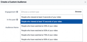 - На основе анализа производительности кампаний создайте в Ads Manager пользовательские аудитории, которые взаимодействовали с вашим контентом. Установите критерии для разделения ЦА, например, для тех, кто посмотрел ролик не менее 10 секунд, 25% и т. д.: