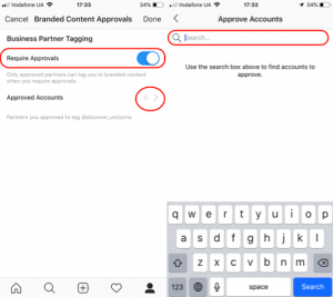 - Нажмите «Отметить партнера» и в поиске найдите нужный бренд. Если компания отображается в результатах поиска, но вы не можете отметить ее, свяжитесь с ним и попросите одобрить вас. После этого вы можете отредактировать публикацию и добавить тег.