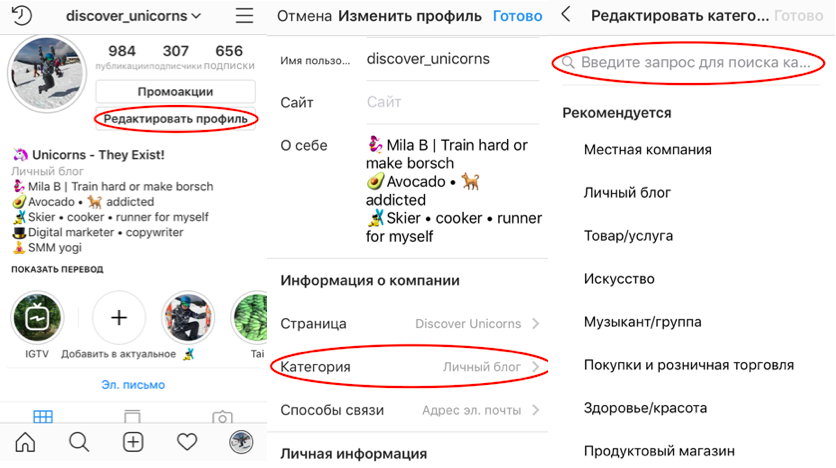 Теперь всем будет видна категория вашего аккаунта: магазин, сообщество, личный блог, бренд, публичная личность и прочее. Категория — это довольно абстрактная попытка систематизировать бизнес-аккаунты. Вы всегда можете поменять категорию, но выбирать придется из тех, что предлагает Инстаграм.